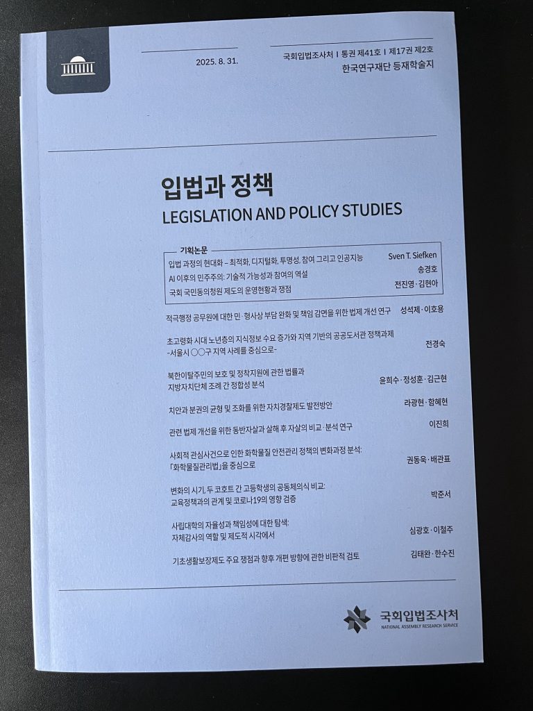 Sven T. Siefken (2025): Modernizing the Legislative Process – Optimization, Digitization, Transparency, Engagement and Artificial Intelligence. In Legislation and Policy Studies 17 (2), pp. 9–37.