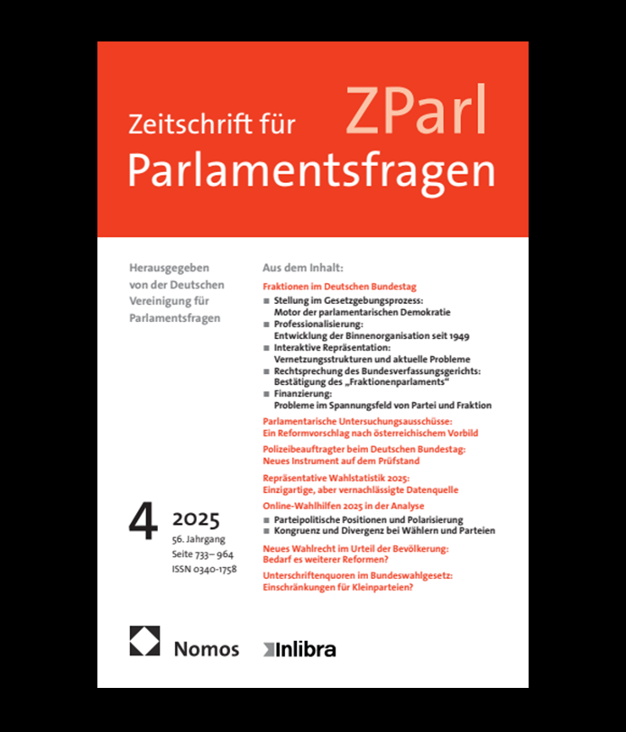 Sven T. Siefken (2025): Fraktionen im politischen Prozess: Fünf Schritte zum Verständnis des Motors der parlamentarischen Demokratie in Deutschland. In Zeitschrift für Parlamentsfragen 56 (4), pp. 859 – 875.