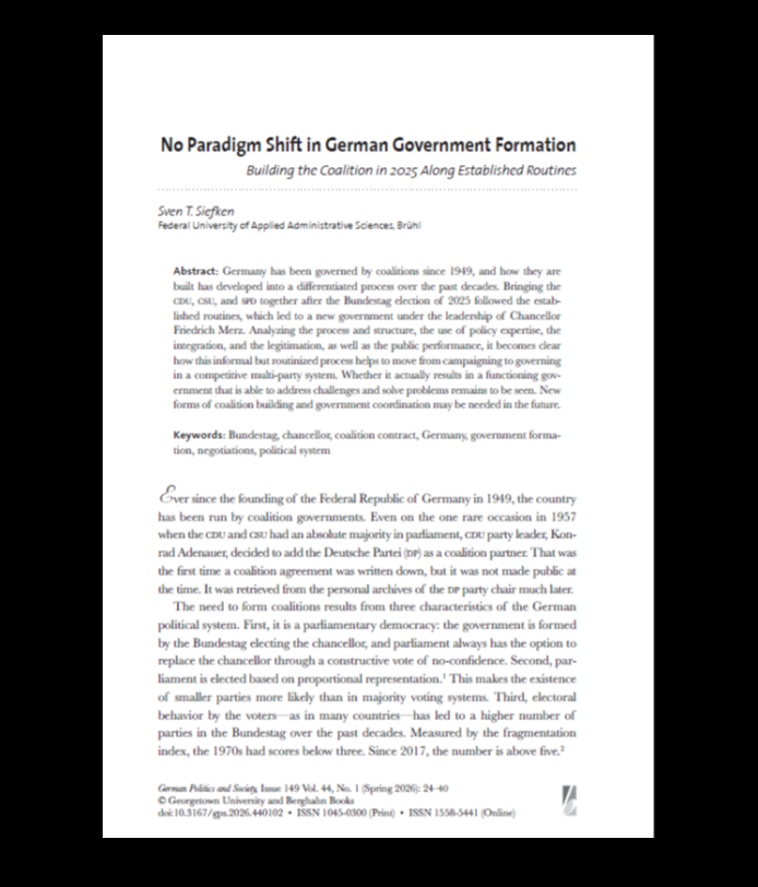 Sven T. Siefken (2026). No Paradigm Shift in German Government Formation, Building the Coalition in 2025 Along Established Routines. German Politics & Society 44 (1), pp. 24–40.