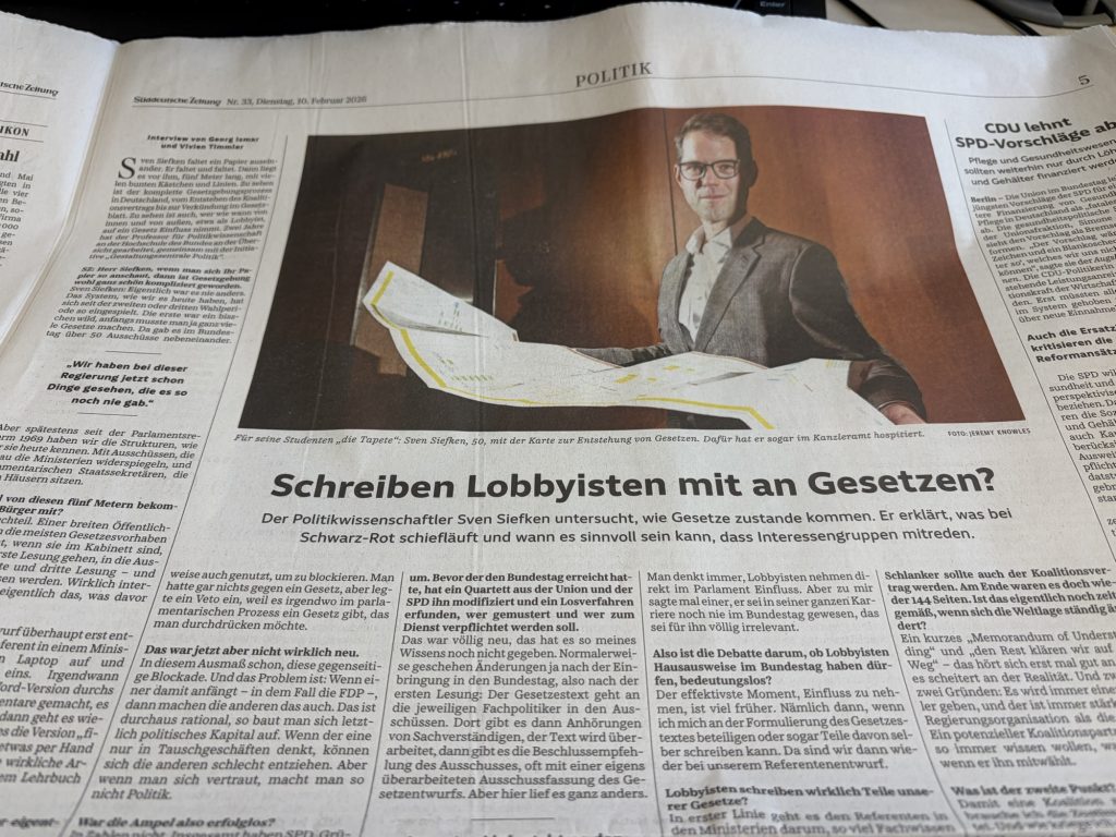 Interview with Süddeutsche Zeitung: the long and winding road of the legislative process in Germany. We mapped the complex stages of negotiation, preparation and coordination that turn an idea into law. And who influences them. Currently on 5 meters of paper, soon in digital form. A joint project with Gestaltungszentrale Politik, subscribe to our newsletter to receive updates! The full interview is in the print edition of February 10. https://www.sueddeutsche.de/politik/gesetze-entstehung-politikwissenschaft-interview-li.3371781?reduced=true